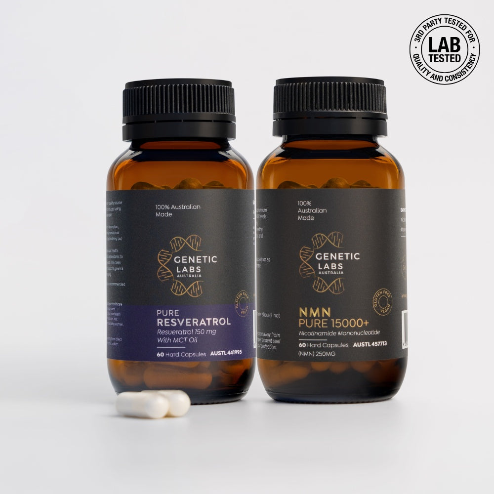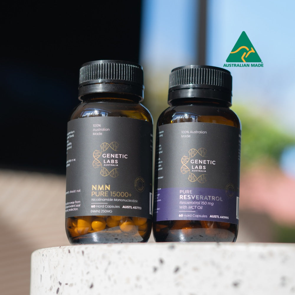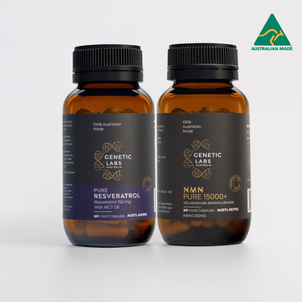 Enhance your longevity routine with the premium quality of NMN Pure & Resveratrol Bundle, proudly Australian-made and featuring NMN PURE 15000+ alongside our Pure Resveratrol enriched with MCT Oil. This stack is meticulously crafted under stringent standards to support longevity with scientifically validated ingredients.
